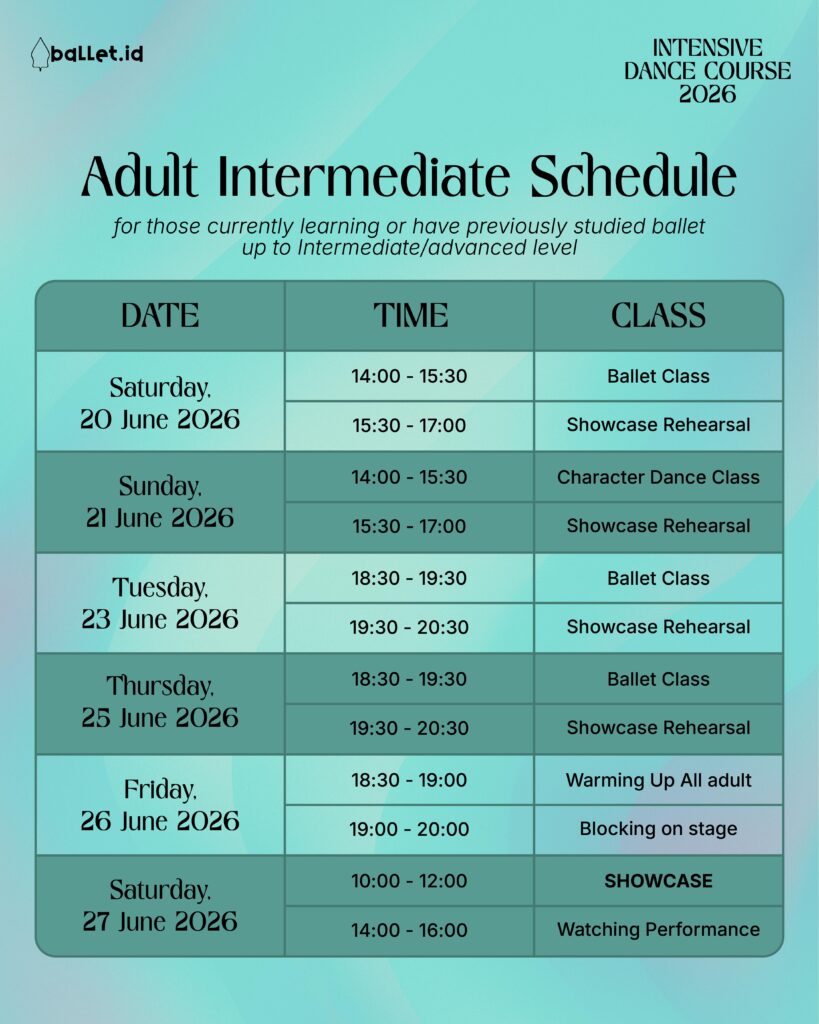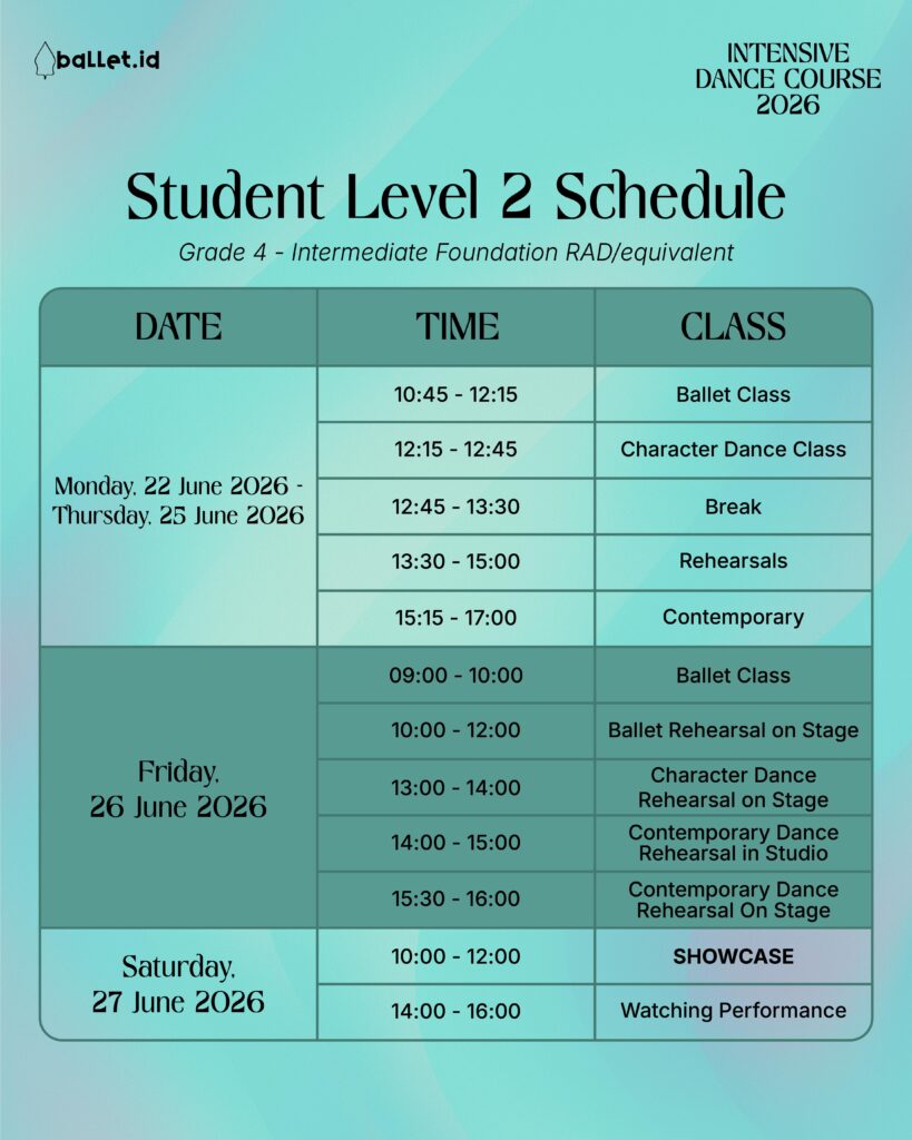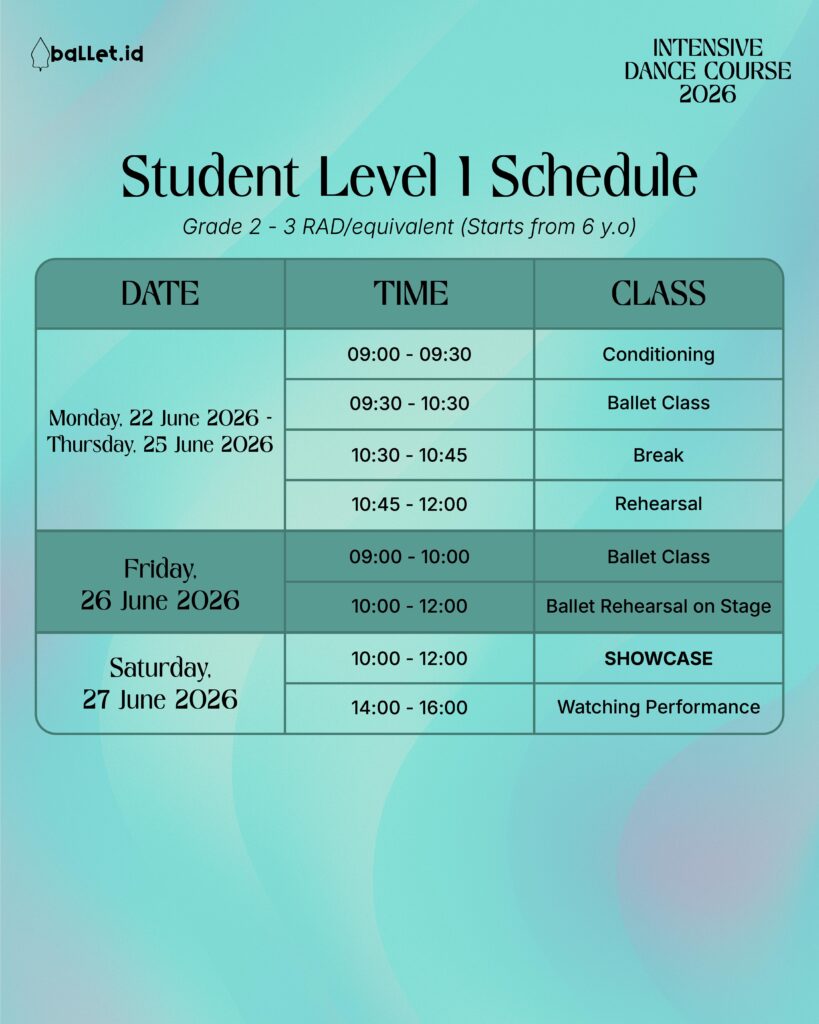 The Intensive Dance Course (IDC) is one of Ballet Indonesia Foundation’s longest-running educational programs, first introduced in 2013 and held annually during the school holidays. As a non-profit organization founded in 2014, Ballet.id created IDC to provide young dancers in Indonesia with access to international-standard training, world-class teachers, and a nurturing environment that supports artistic growth and discipline. IDC continues to be a cornerstone of Ballet.id’s mission to strengthen and expand the dance ecosystem in Indonesia.